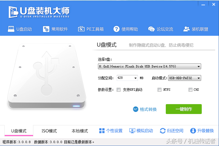 2.打开软件,插入U盘,会显示如图,此时点击一键制作即可。