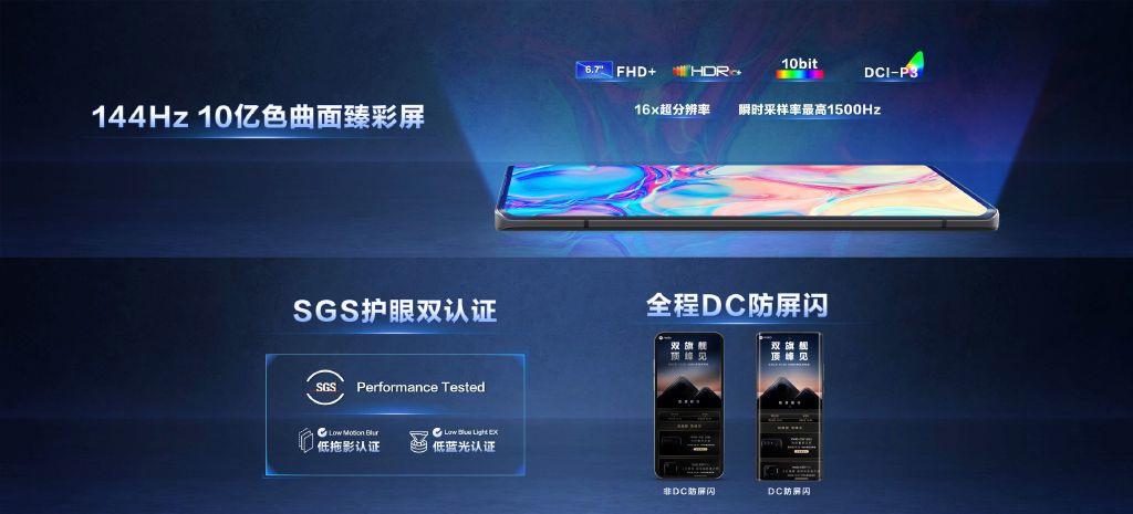 屏幕方面,moto X30 Pro 使用了一块 6.7 英寸柔性 OLED 曲面屏,支持 144Hz 高刷新率,拥有 10bit 色彩,DCI-P3 色域,支持全局 DC 调光,拥有 SGS 护眼双认证。