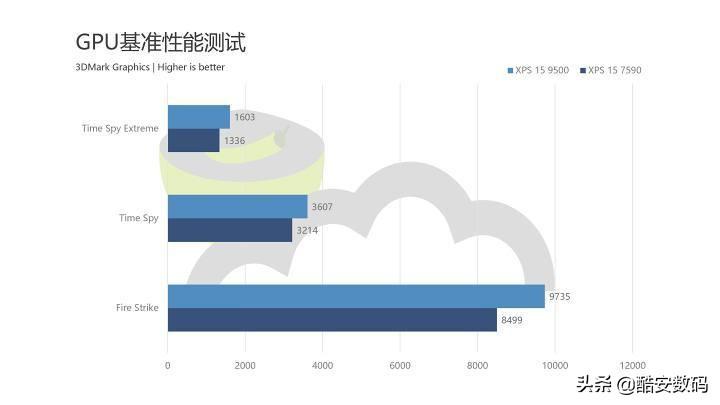 正常来说 GTX 1650 Ti 相比于 GTX 1650 提升幅度在 7%,但由于 XPS 15 7590 上的 GTX 1650 成绩明显低于平均值,所以这一代的图形性能提升有 15%,还算不错。