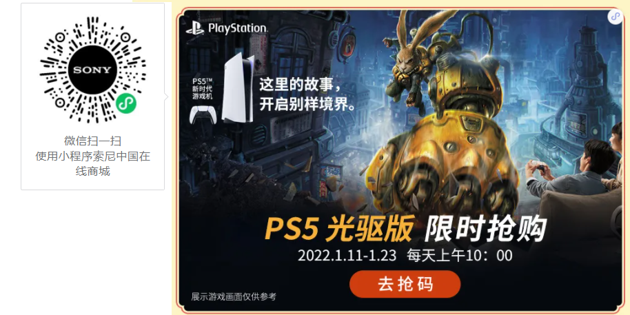 用户可以通过微信小程序索尼中国在线商城,在每天上午 10 点抢购 PS5 游戏主机光驱版。具体时间是 2022 年 1 月 11 日-1 月 23 日。