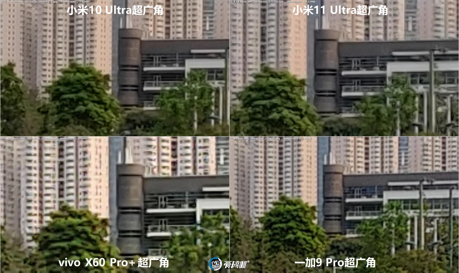 (X60 Pro+细节略强于一加9 Pro,但一加的边缘劣化控制更好,它们都比超大广角的小米11 Ultra强)。