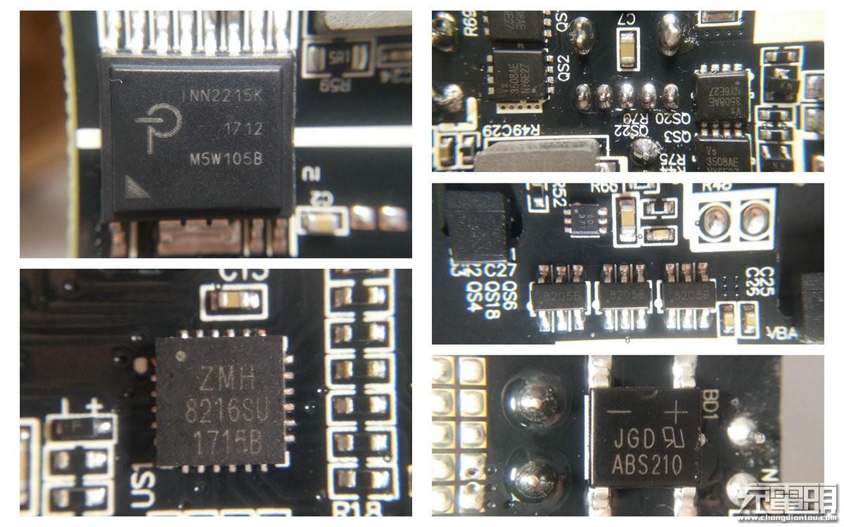 AC部分主控是集大成芯片来自PI的INN2215K,一颗芯片解决所有问题。ZMH8216SU是紫米定制的移动电源主控,在紫米的其他产品上同样出现过,具体参数信息不详。
