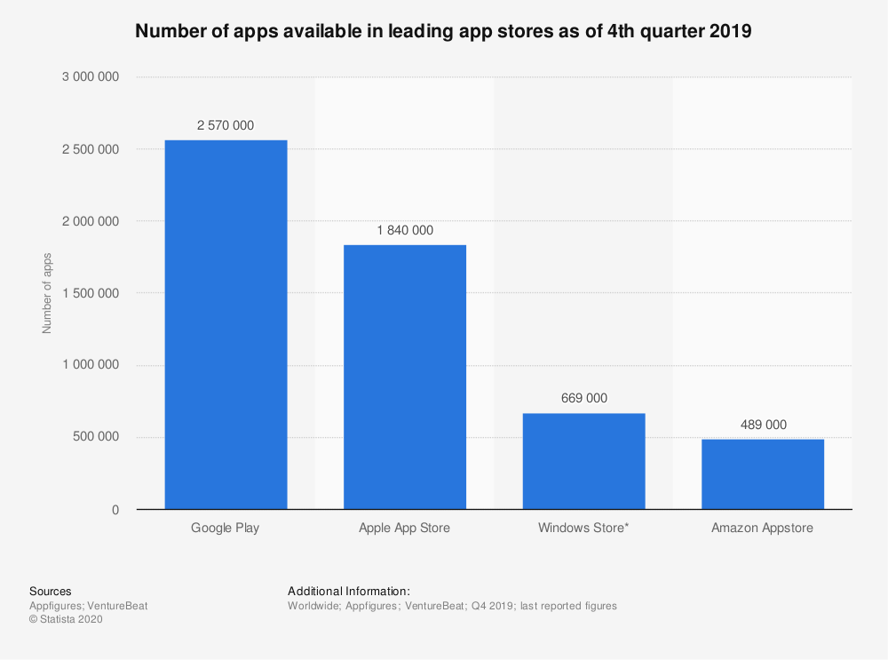 根据Statista数据统计,截至2019年第四季度,谷歌应用商店(Google Play Store)上大约有257万个安卓应用程序,而且这个数字一直在增长。从现在起,许多规模不等的公司都将移动应用程序纳入其营销战略。