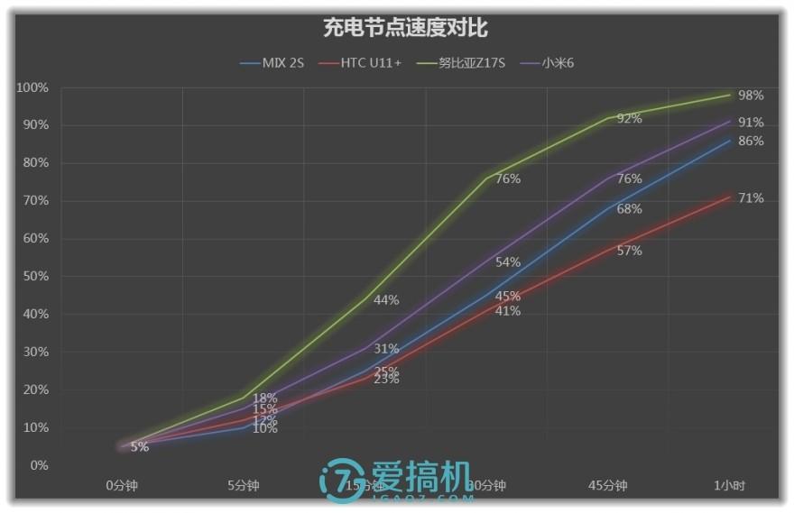 小米MIX 2S充电速度属于高通QC快充阵营的正常水平,不会成为瓶颈,但也不会惊艳。实际5%-100%充电,15分钟充到25%,30分钟充到45%,1小时86%,充饱共耗时1小时35分,比数据库中的小米MIX 2稍微快个6分钟左右,但比3350mAh电池的小米6要慢一些。比OPPO、努比亚等低压快充技术机型、以及用mCharge的魅族旗舰都要慢。