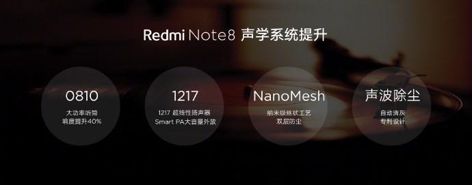 Redmi Note 8搭载骁龙665处理器,第三代AIE引擎,配备了 4000mAh大电量,标配18W快充 ,支持Type-C、红外遥控、3.5mm耳机孔统。音质进行了升级:采用1217超线性扬声器,隐藏技能声波除尘,0.4mm最大振幅,自动清灰专利设计,甚至还能吹灭蜡烛。
