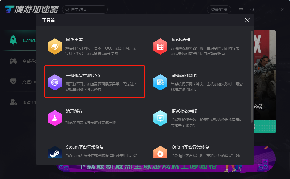 很多玩家知道可以通过修复DNS地址来让解决这个问题,但是却不知道实际操作的方法,其实只需要打开腾游加速器的工具箱就可以一键修复本地DNS了。