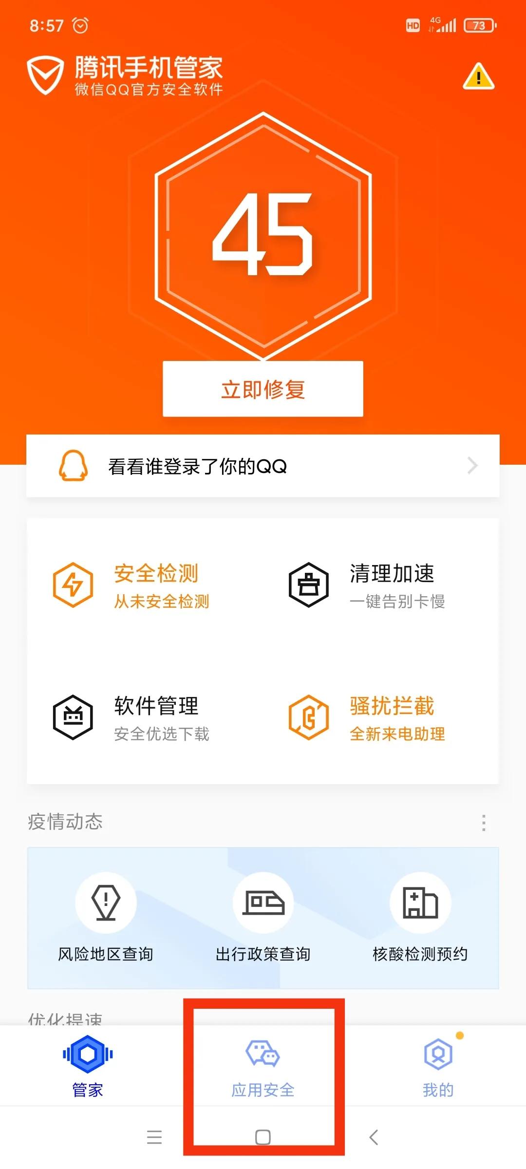 第二步,打开腾讯手机管家。我们会看到底部有一个“应用安全”。