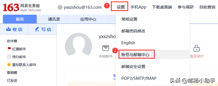 (1)邮箱首页--点击“设置”--“账号与邮箱中心”(如下图所示);