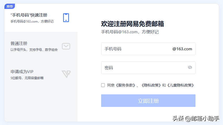 填写“手机号码”、设置邮箱“密码”,点击“立即注册”即可。目前只有@163.com支持手机号码快速注册。PS:因手机号都是唯一的,所有不会出现重复情况。
