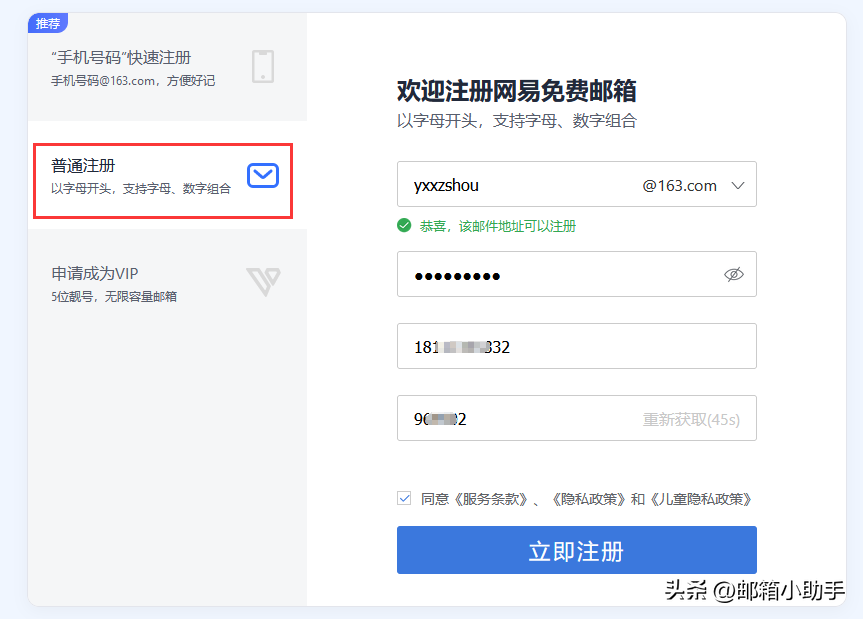 设置邮箱“密码”,填写“手机号码”进行短信验证,点击“立即注册”即可。PS:若邮箱密码忘记,可以通过手机号找回密码。