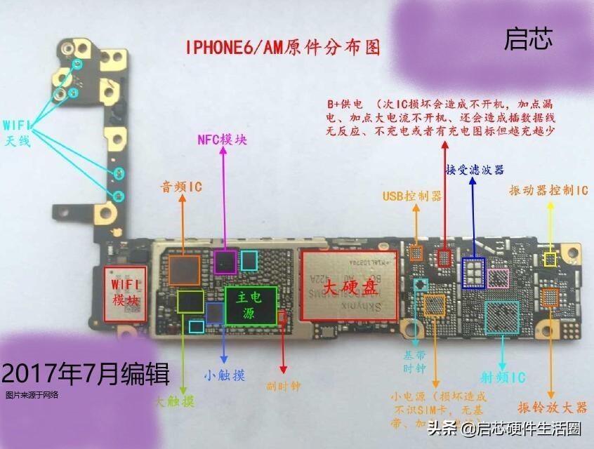 红色:海力士的16GB闪存芯片橙色:日本村田的339S0228 Wi-Fi芯片黄色:338S1251-AZ电源管理芯片绿色:博通的BCM5976触控芯片蓝色:M8协处理器(其实是NXP的LPC18B1UK)粉色:同样来自NXP的NFC芯片,具体型号是65V10 NSD425黑色:高通的WTR1625L射频芯片,全网通的另一大组成部分
