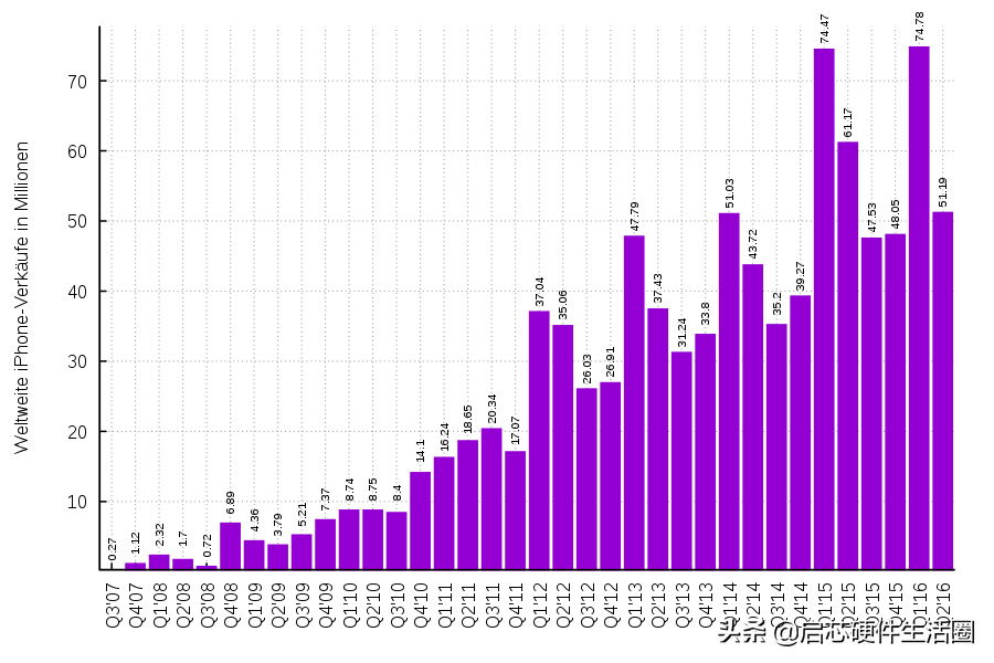 然后,给出了苹果手机的历年销量图,截止到2016年Q2季度,没有到最新的,这份表单更为全面。基本趋势可以看出,整体速度是上升的,但是增速确实在下降,但体量依旧很大。这条曲线,让我想到了中国的GDP情况, 好像也是类似的曲线。改革开放前30年基本都是10%的增速,但现在基本6.8%左右,也有很多人唱衰,却没有考虑到中国第二大经济体的体量已经极为庞大,保持当前增速已经极为不容易了。