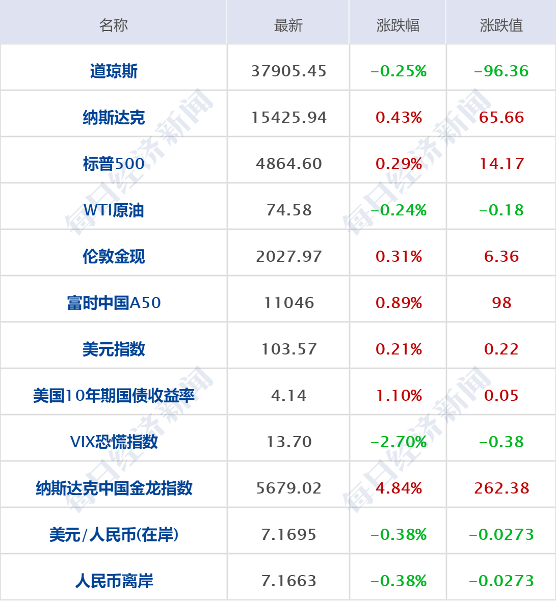 美股三大指数收盘涨跌不一,道指跌0.25%,纳指涨0.43%,标普500指数涨0.29%,热门科技股多数上涨,英特尔涨超1%,苹果、微软、谷歌、亚马逊、英伟达、特斯拉、Meta涨幅不足1%。航空公司、金属原材料板块涨幅居前,世纪铝业涨超10%,美国铝业公司涨超6%,联合大陆航空涨超5%,南方铜业涨超2%。热门中概股普涨,纳斯达克中国金龙指数涨4.84%。哔哩哔哩涨超9%,阿里巴巴、网易、百度、京东涨超7%,满帮、富途控股涨超5%,小鹏汽车涨超4%,蔚来、微博、理想汽车涨超3%,腾讯音乐、唯品会、爱奇艺涨超1%。拼多多小幅下跌。