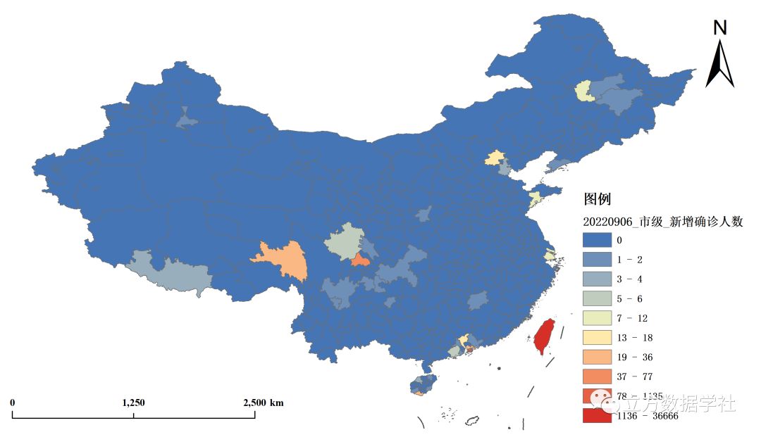 每日的市级新增确诊人数数据汇总在一个shp文件中,我们以2022年9月6日的数据为例来预览一下: