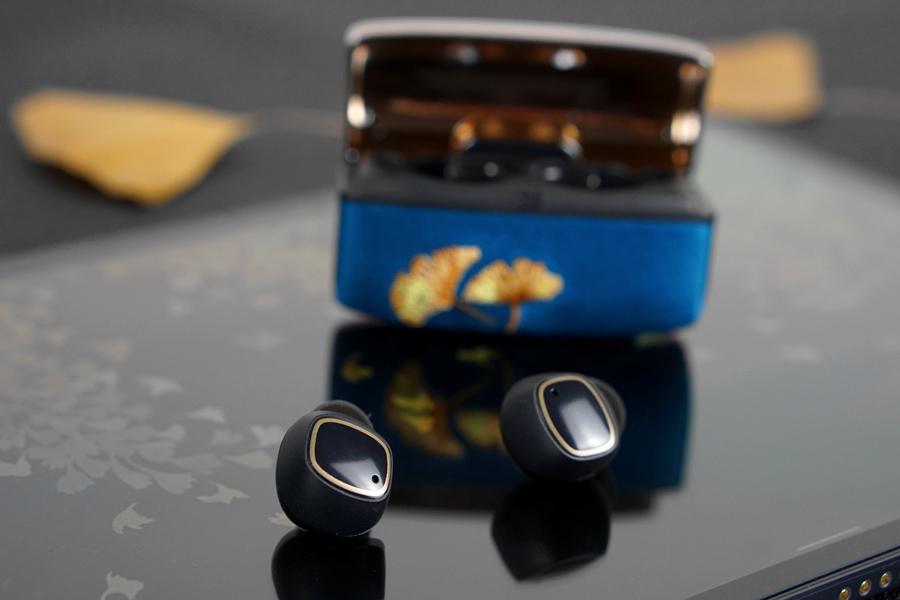 国潮风格的充电盒无疑是这款产品设计的精髓。盒身的下半部分被传统工艺制成的锦缎所包裹,带有轻微流光效果的孔雀蓝配色给它增添了一丝灵动。两片银杏叶实际上也是传统的刺绣,金黄色和铜黄色的合理搭配让它们看起来更加鲜活精致。不过,锦缎的材质自然在耐脏性上不比塑料或者金属,而且因为充电盒本身不防水,也不太容易清理。