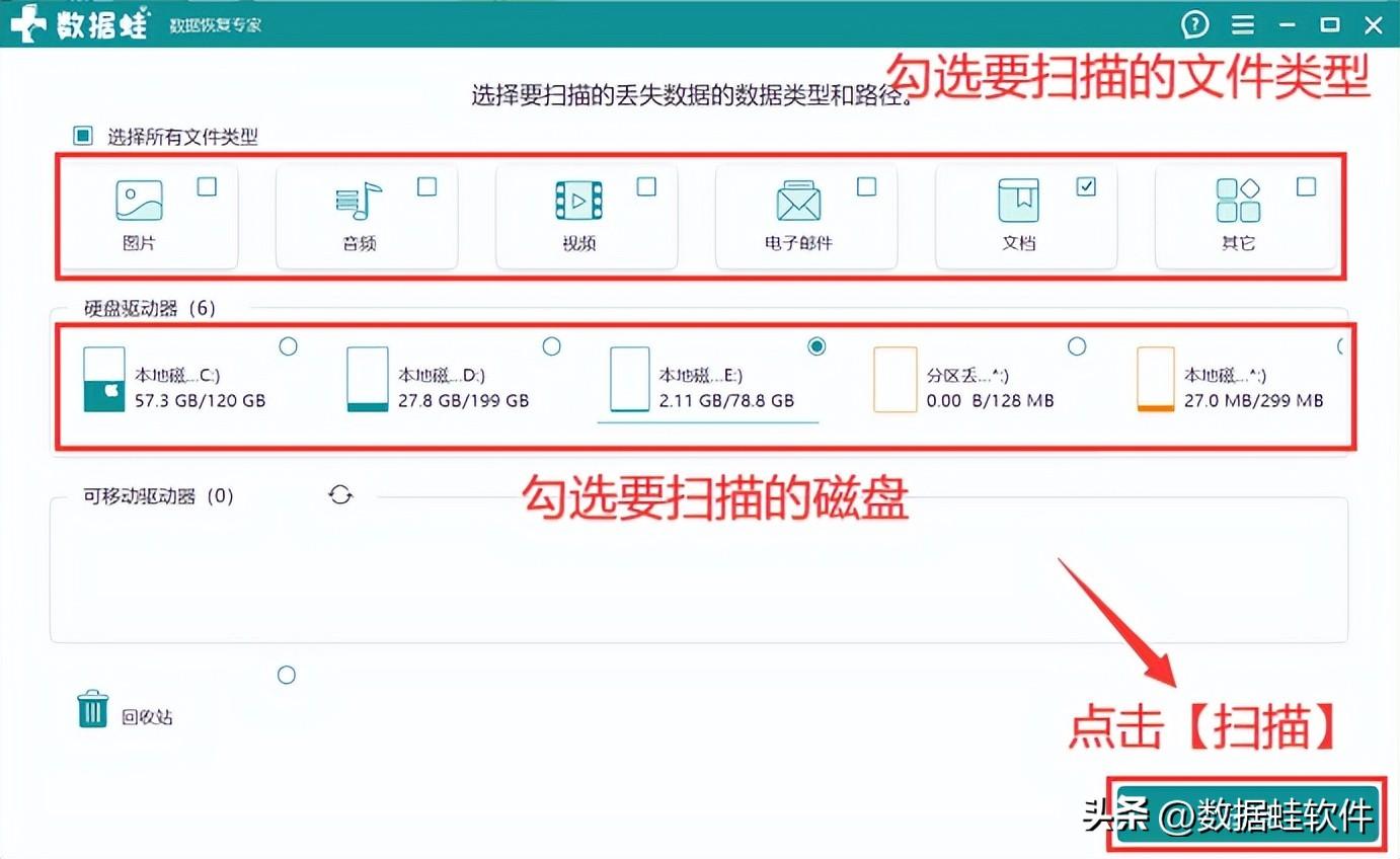 步骤2:在选择界面,用户需要确定扫描的文件类型,将其勾选上,并勾选上需要扫描的磁盘(若需要扫描回收站,可直接勾选),点击【扫描】;