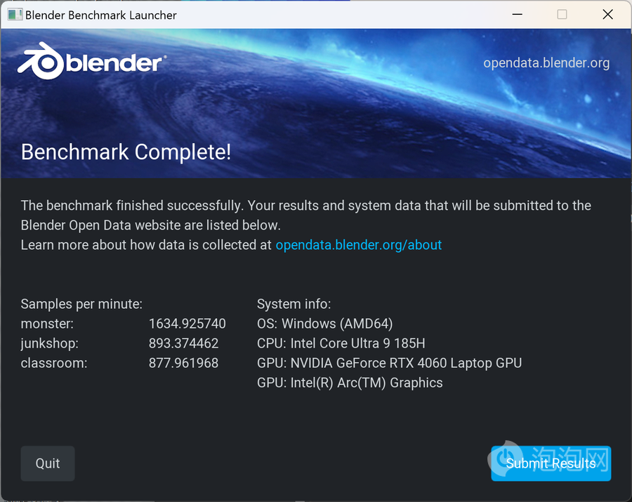 Blender BenchMark是一款常用的渲染工具测试软件,三种渲染场景每分钟采样数分别为1634,893以及877。