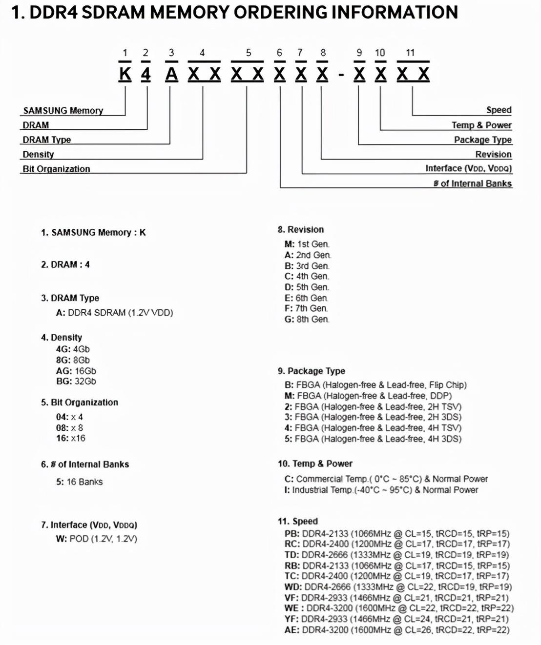 而第二行——“K4A8G04”,其中前三个字符“K4A”是通用字符,代表了DRAM的版本,紧跟着的后两个字符“8G”则代表的是内存容量,“8G”代表的是32G,“AG”代表的是16G,“BG”代表的是32GB。