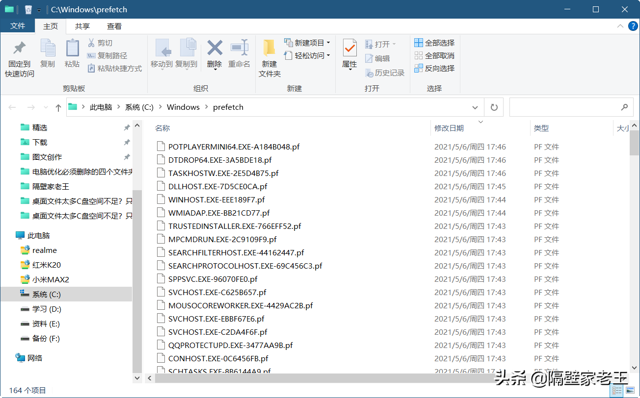 这里存储的是电脑访问过的一些预读信息,没有什么用,也可以直接删除掉。路径为C:\Windows\prefetch,操作方法同上。
