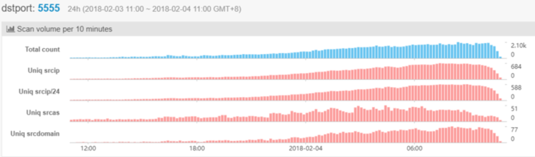 360网络安全研究院监测发现,5555 端口上的扫描流量从2月3日下午15:00左右,开始达到日常数据的3倍,24:00左右到达10倍。这种异常现象,一般都预示着有新型的僵尸、蠕虫或新的网络事件出现,在进一步挖掘求证之后,360网络安全研究院发现了ADB.Miner蠕虫。