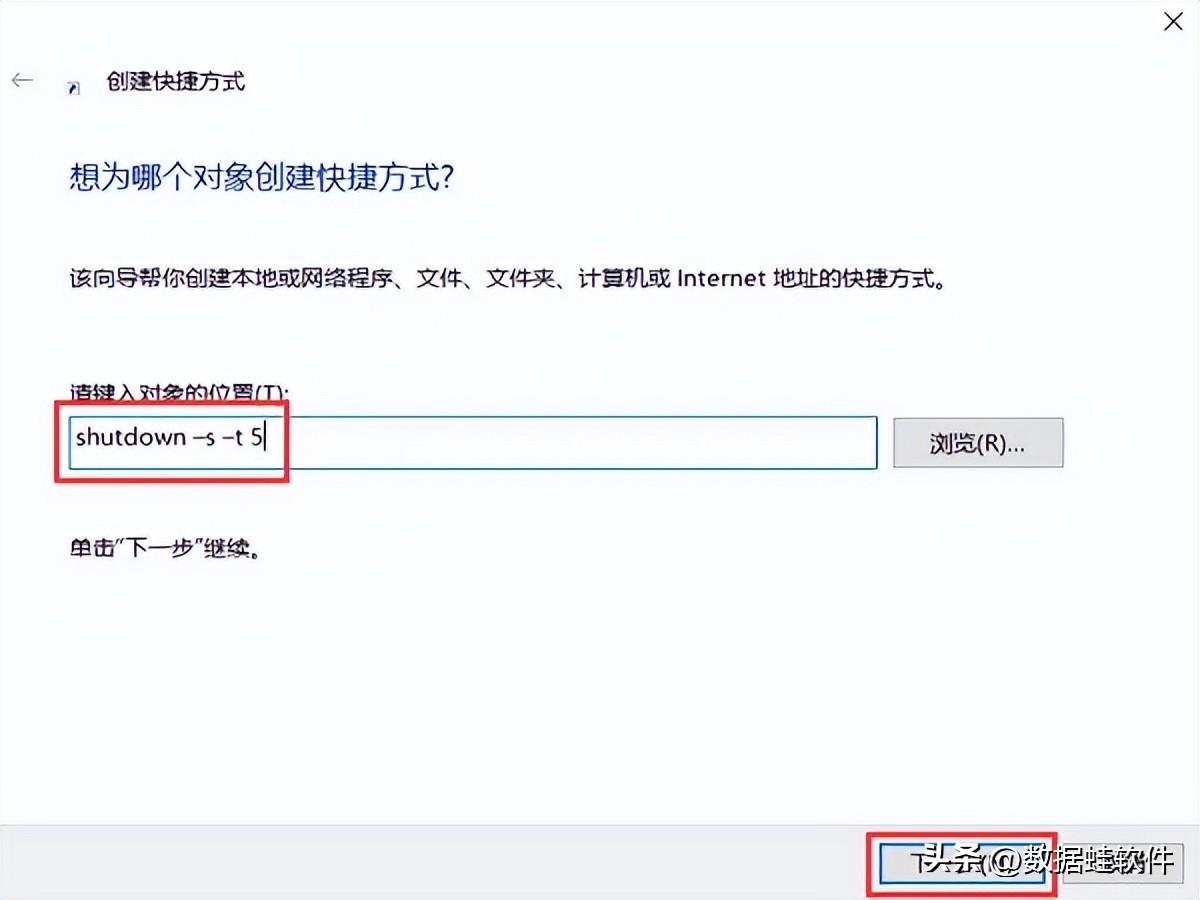 我们还可以自己设置关机快捷键。在电脑桌面右键单击空白处,选择【新建】里的【快捷方式】。在打开的窗口,输入【shutdown –s –t 5】,单击【下一步】。