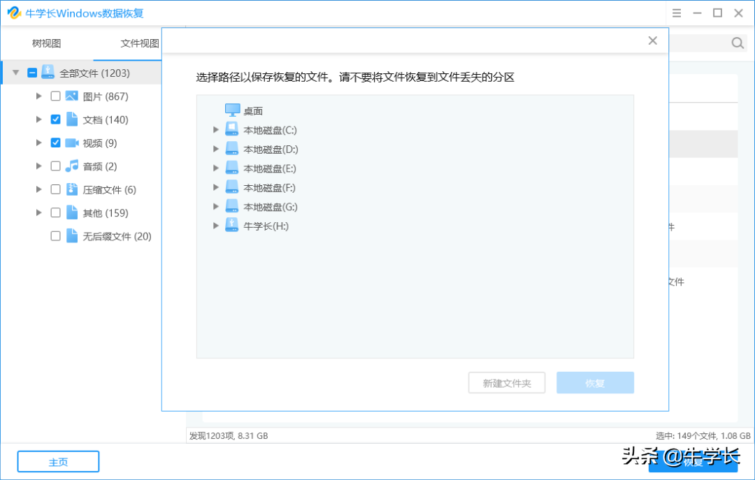 支持恢复U盘中的照片、视频、音乐/音频、RAR / ZIP、Office文件等多种文件类型。(在任意浏览器搜索“牛学长官网”即可下载工具)