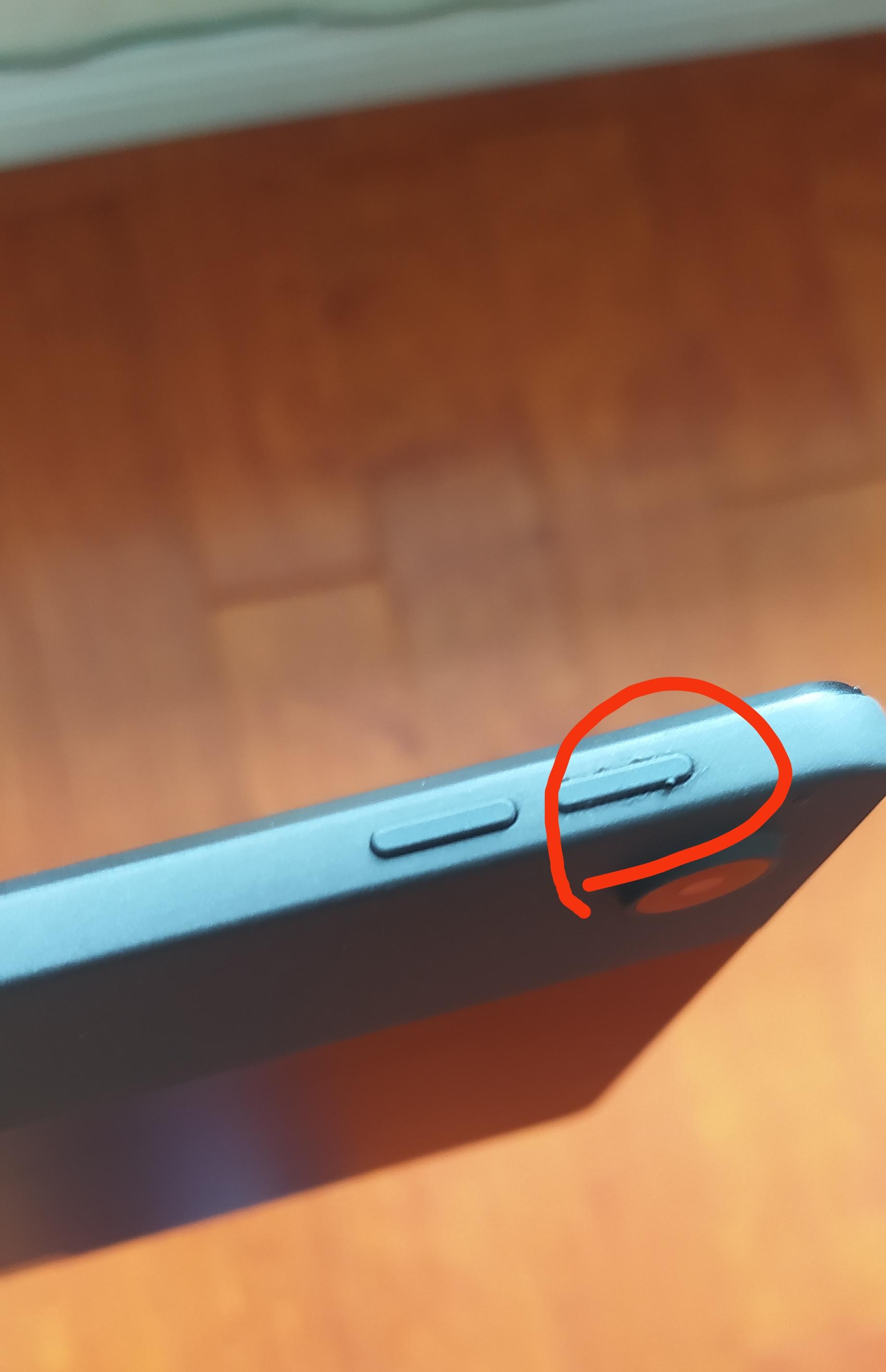 问题在哪里呢?想了想,先把皮套去掉吧。去掉后,我再次按电源键10几秒,还是无任何反应。好吧,强制进入工厂测试模式看看,同时按电源键和音量—键10秒以上,还是不行,再次同时按电源键和音量+键,哎,有问题了,音量+键无任何反应,此音量+键陷下去了,弹不起来了,估计问题出在这里。立马拿了一个小镊子,在此键左边、右边的缝隙里,轻轻的往上挑动,此键瞬间弹出来了。我又再次按按此音量+键,弹性有些弱,反应不是很灵敏。