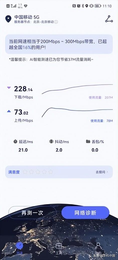 通过实测,在室外环境下,佩戴5G通信壳的华为P50 Pro下行速率为228.14Mbps,上行速率为73.02Mbps;佩戴5G通信壳关闭5G时下行速率为43.14Mbps,上行速率为14.24Mbps。