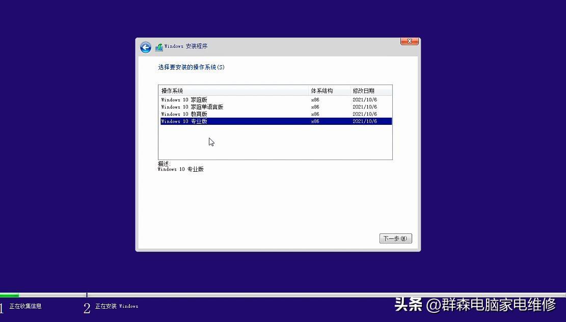 选择安装的操作系统,直接就选专业版。进入下一步安装。