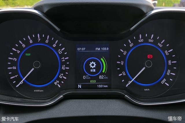 帝豪EV450采用了全液晶仪表盘,相比老款车型的机械+液晶组合式仪表盘是一个不小的升级。在界面设计上,左边是电池电量表,右边是电机功率表,中间是速度表和多功能显示区域。