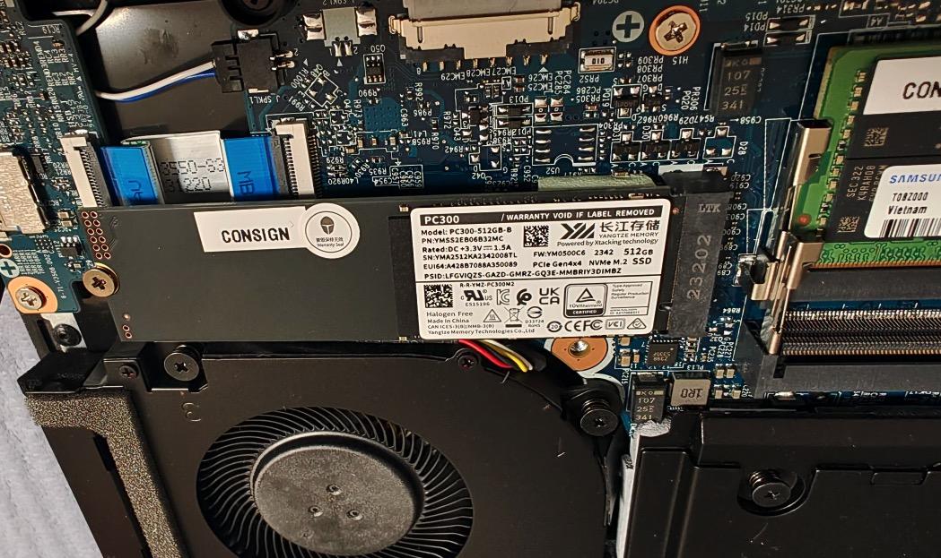 硬盘则是来自长江存储的 PC300 512GB SSD,PCIE 4.0 通道,有三个 M.2 接口,支持组建 RAID5 阵列。