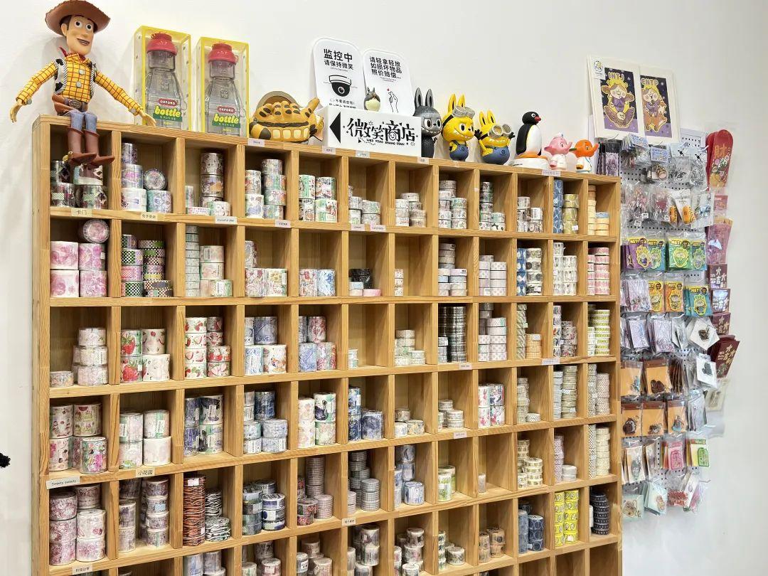手帐区内,IP印章、贴纸转筒墙、胶带、N次贴……各种手帐、胶带、贴纸更是令人眼花缭乱。值得一提的是,店内还能看到日本文具大赏评和三菱笔博物馆,罗列了历年得奖商品。