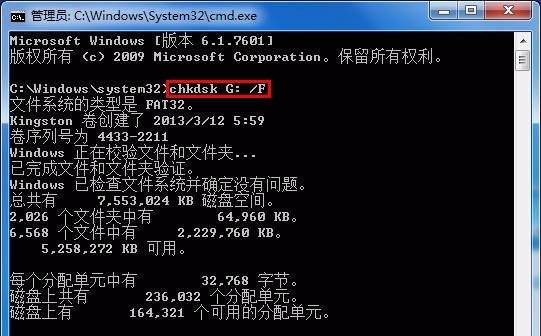 2、输入chkdsk G: /F(其中G:是U盘盘符,如果U盘是G盘就输入chkdsk G: /F),输入后点击键盘回车键: