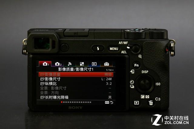 机身背面,我们能看到一块16:9宽屏比的3英寸显示屏,屏幕本身分辨率达到了92万画点,显示清晰度没有问题,只是因为是宽比屏幕,在照片取景时屏幕会留有黑区。此外因为屏幕很扁,也直接影响到了相机的菜单显示,每级菜单只能显示6项,这在很大程度上也限制了索尼的菜单的设计。相对的,索尼A6500的屏幕更适合用于视频拍摄取景(比例相同),可能是本身的设计侧重吧。