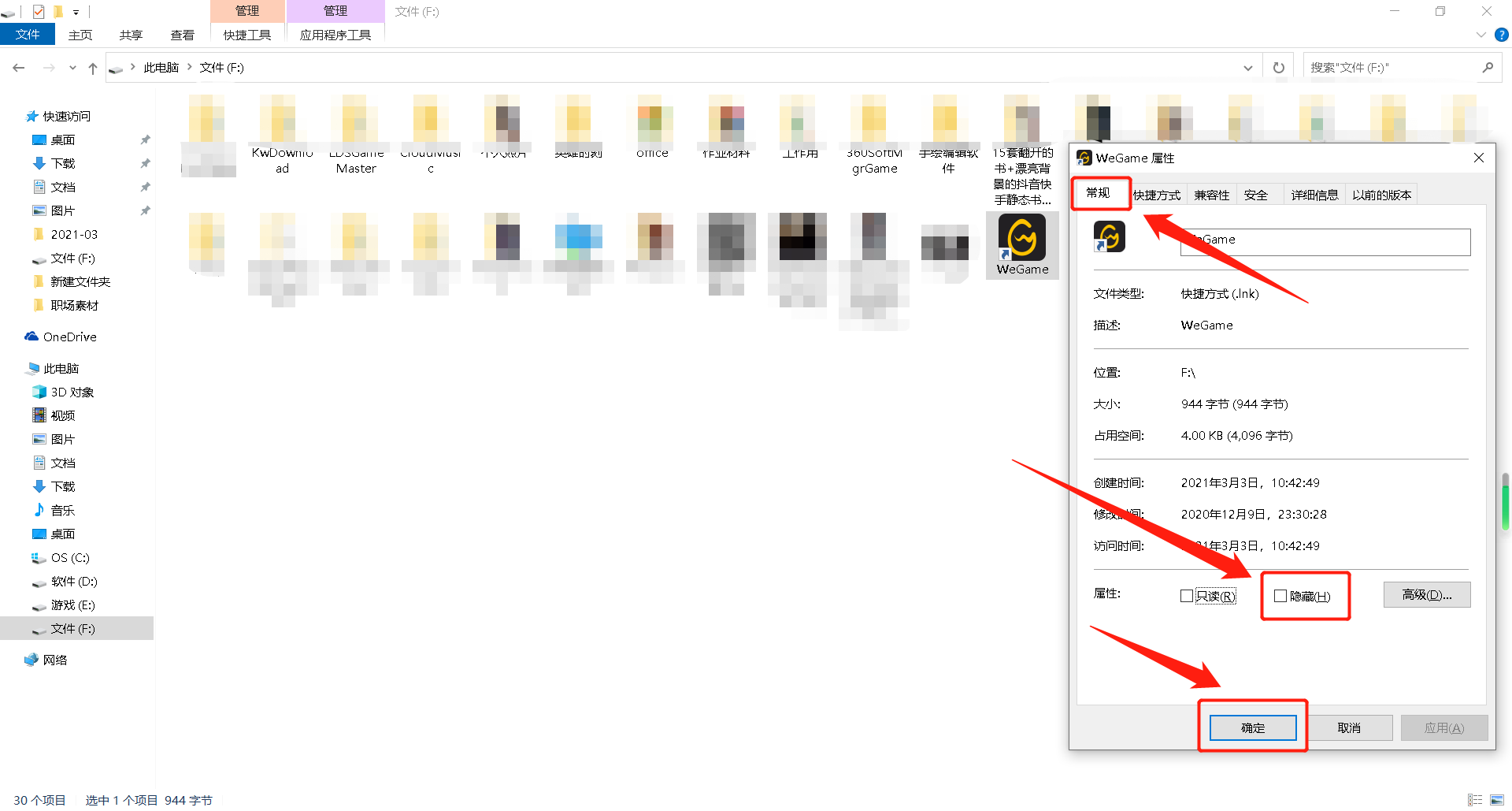 将游戏快捷方式迁移到电脑的磁盘空间内,然后下一步就可以对这个快捷方式进行隐藏了。使用鼠标右键点击快捷方式,然后选择属性,在弹出的界面点击常规、勾选隐藏选项,点击确定。如下图: