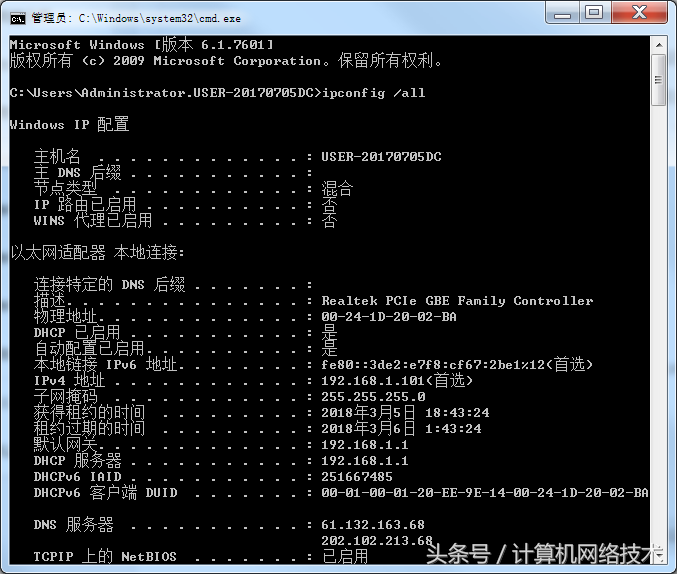 2、在弹出窗口中,输入“ipconfig /all”,注意不带双引号,然后回车。记下IP地址,子网掩码,网关,DNS服务器地址。