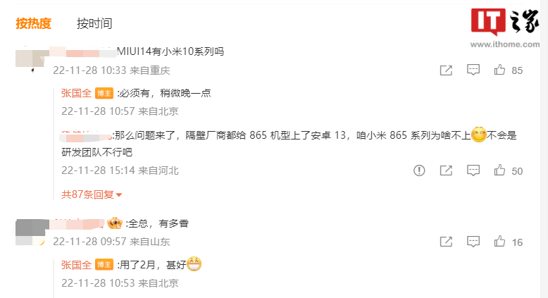 在机型适配方面,预计除了小米 12S 系列、小米 12 系列、小米 11 系列,小米系统软件部总监张国全还表示,小米 10 系列也将升级 MIUI 14,只是可能会稍微晚一些。