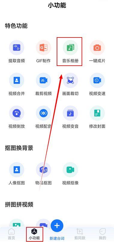 第一步:在手机打开该软件,在【小功能】页面选择【音乐相册】,导入我们需要制作的图片。