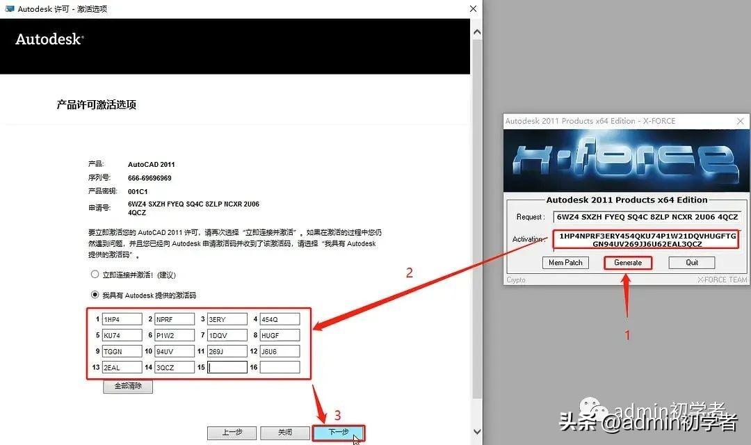 然后点击generate,生成激活码在注册机的第二行,我们将激活码复制,粘贴到激活界面到激活码框内,点击下一步