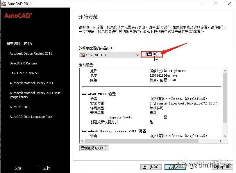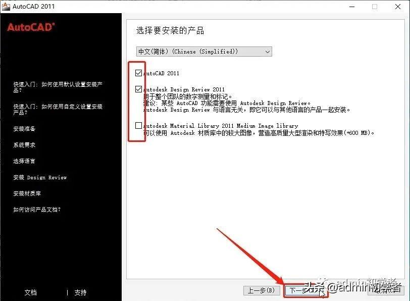 在选择要安装到产品界面,选择中文简体,以及autocad2011,剩余两个产品可以根据自己到需要进行安装,点击下一步