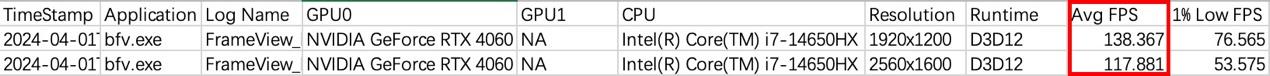 第二个游戏是压力在线多人大战场射击游戏《战地 5》,这个游戏既吃显卡又吃 CPU,对笔记本的性能压力还是比较大的。进入游戏后我们一 DX12 模式运行,不开启光追和 DLSS,画质选择最高,在 1200P 分辨率下游戏平均帧数为 138 帧,1% Low 帧为 76 帧;而 2K 分辨率下平均帧数为 117 帧,1% Low 帧为 53 帧。虽然平均帧数都能跑到接近 120 帧或以上,游戏体验还是能够保障的,但 2K 分辨率下 1% Low 帧不到 60 帧,还是会让人捏一把汗。