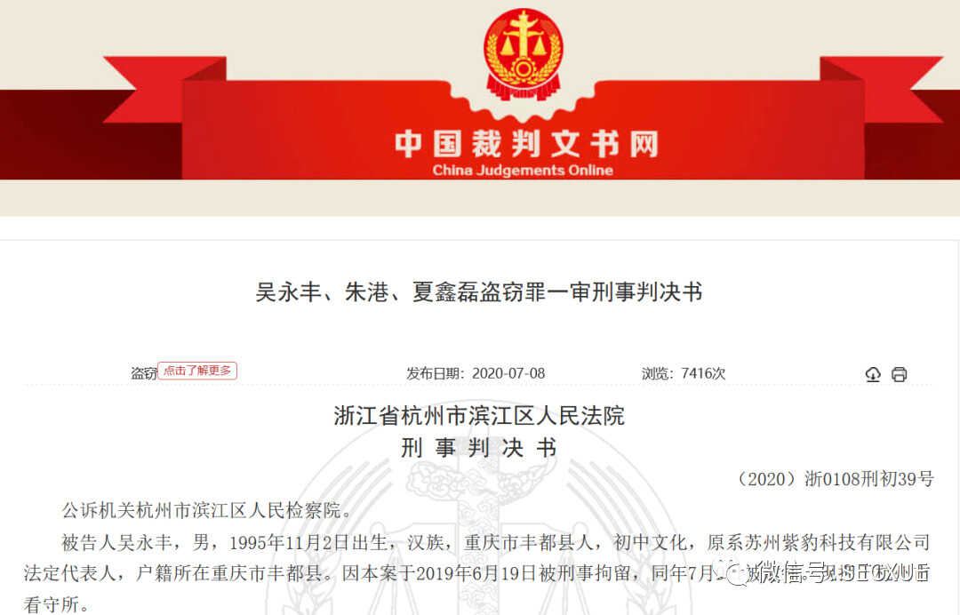 2020年6月19日,杭州市滨江区人民法院做出判决,原苏州紫豹科技有限公司法定代表人吴永丰犯盗窃罪,判处有期徒刑十二年,并处罚金人民币30万元。