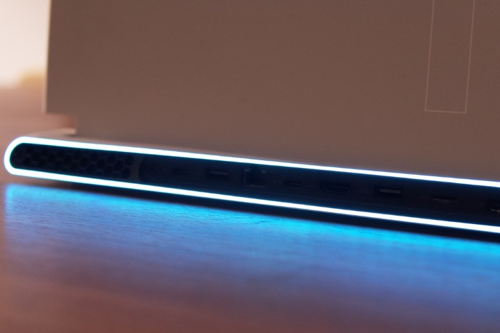 可能是因为机身较薄,USB-A、Type-C、网线、HDMI 等接口只能放在机身背部,被环形灯带围绕,让两侧的出风口显得很有秩序。点亮灯带后,Alienware X17 还有了一些科技感。