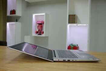联想IdeaPad 320S最大开启程度。散热口位于屏幕下方的转轴处,当屏幕打开至正常操作时,散热流向是后,被转轴阻挡后变成向上和向下分别散出。