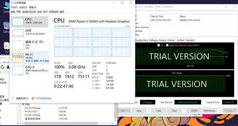 通过AIDA64单拷FPU测试,小新Air 14 2021锐龙版处理器在前5分钟可以稳定36W左右性能释放,处理器温度87度左右,主频3.45GHz,“真男人”持续时间比想象中更长。