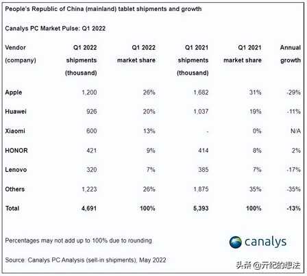 5月27日消息,知名市调机构Canalys发布了2022年Q1中国平板电脑出货量榜单: 总出货量仅为470万台,同比下跌13%,这也是出货量连续下跌的第四个季度。凭借120万台的销量,Apple依旧排名第一。凭借发布不到1年的两款产品,小米打败了联想和荣耀,以60万台的销量排名第三,成为榜单上最大的黑马。