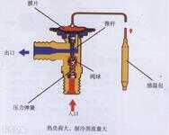 反之,当温度过低时,膨胀阀开启度会变小,会使进入蒸发器内的氟利昂下降,从而使蒸发器内温度升高。