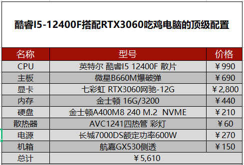 这套12代i5 12400F配RTX3060组装电脑配置推荐不到6000元,,这套配置完全可以在1080P分辨率下通吃各类游戏大作,2K分辨率下也可以满足大多数游戏需求.