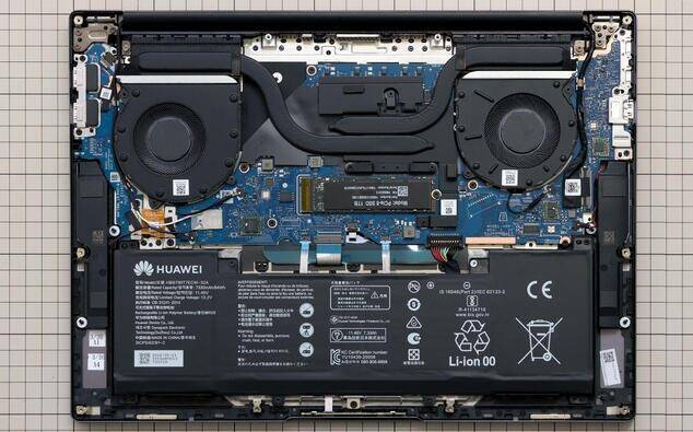 MateBook 16s 的拆解和上一代相同,没有隐藏螺丝,只需将底部螺丝你全部取下,就能拿下盖板,看到完整的内部结构: