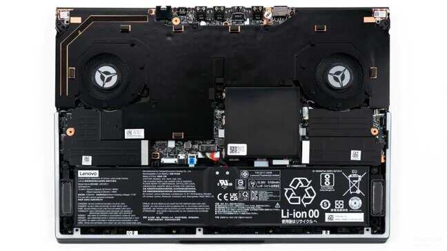 上图是联想 拯救者 R9000K的拆机实拍图,大面积VC均热板+双风扇的组合。
